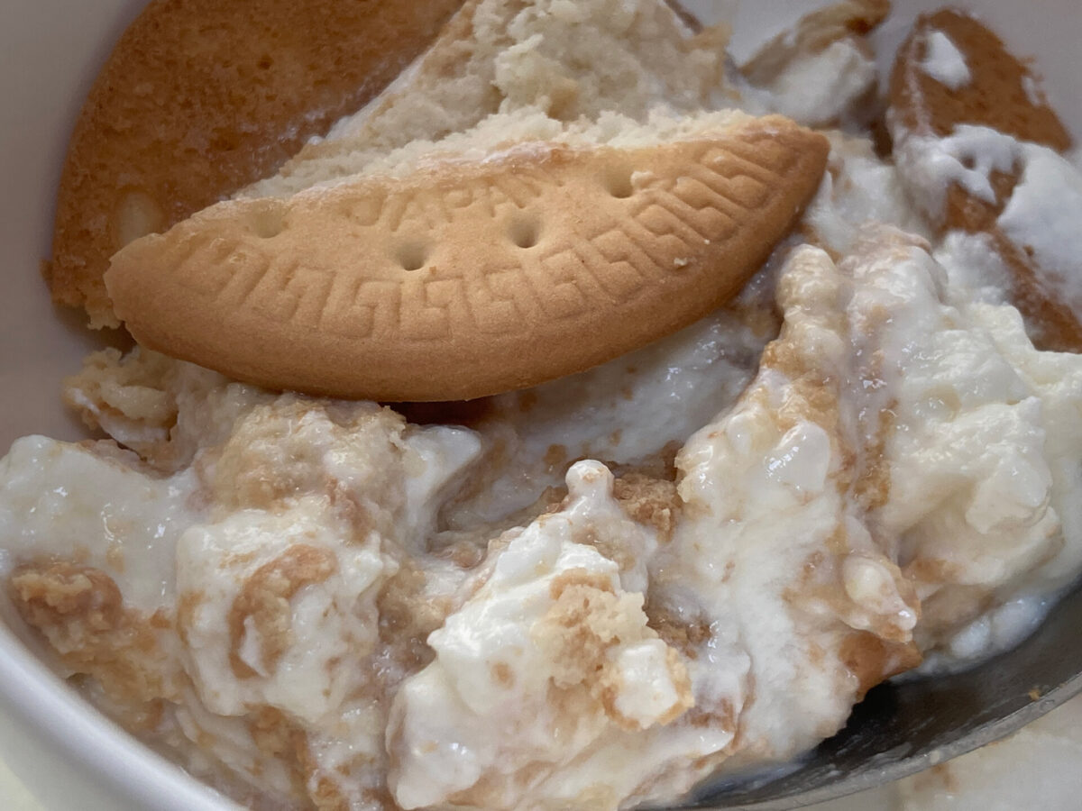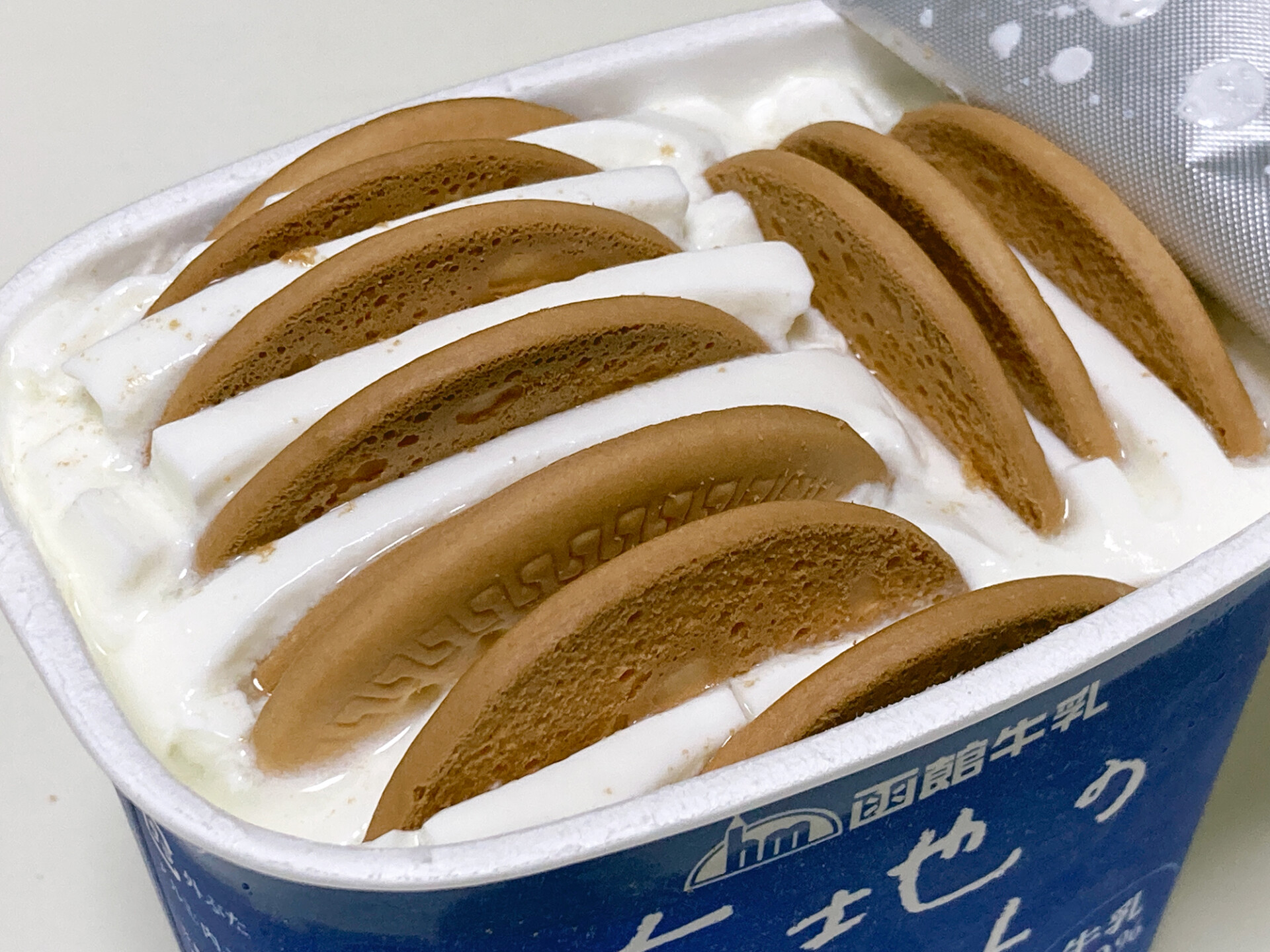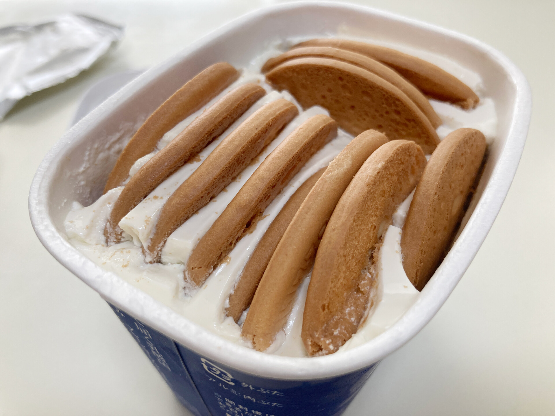 水分を吸ってマリービスケットがヨーグルト部分と馴染んでいます。個人的には少し固形のビスケットが残っていたほうが好みっちゃ好みですけどね。