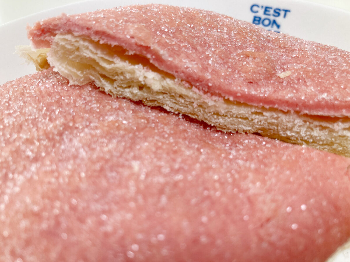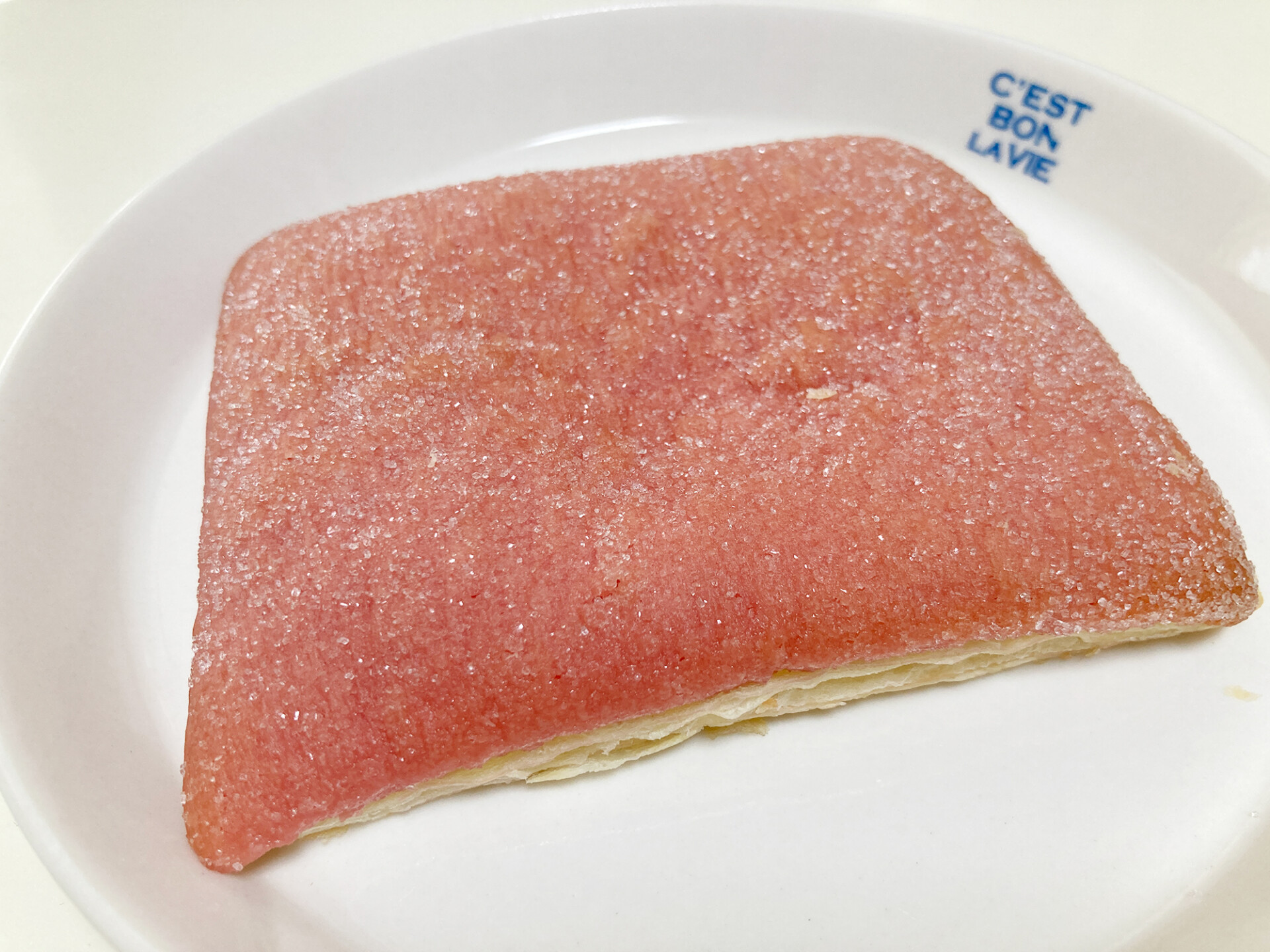パイ生地にメロンパンの皮(いちごミルク風味)がくっついている。