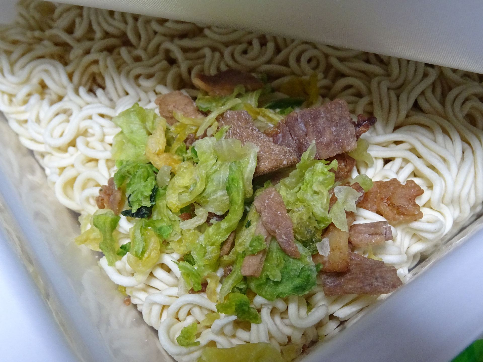 やきそば弁当と比べるなら味とともに違うのが具(かやく)で、某カップヌードルの謎肉風じゃなく、四角くカットされた豚肉が入っています。