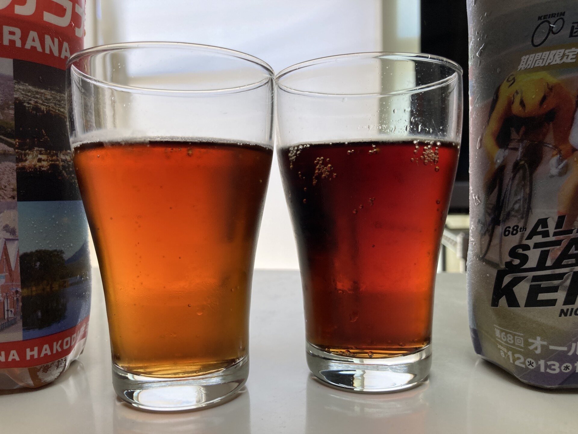 写真は左が「函館ガラナ」で、右が「オールスター競輪ガラナ」です。1種類ずつ飲んでいると全然感じないのですが、並べてみると色が濃いよ~!