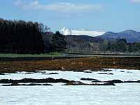 函館市内にはもうほとんど雪が残っていないけど、ちょっと郊外に足をのばすと、まだソコココに冬の名残りが…。ここ大野町の小高い丘陵地の田畑の雪解けはあと少しですね。向こうに見える白い頂は駒ヶ岳です。