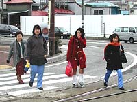 学校帰りの学生さんも寒そう。彼女たちの水色のパンツはけっしてお揃いの格好ではありませんよ。寒いから制服の下に学校ジャージを履いているんですね〜。でもあんまりかわいくないよね、この格好。