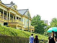 旧函館区公会堂前を、日傘片手に颯爽と通り