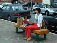 このあっちこっち向きの椅子は、1998年のクリスマスファンタジーに使用された「幸せを呼ぶもみの木」で作った椅子です。座っても幸せが来るでしょう。ちなみに、ここに写っている親子はチョ−美人親子でした。