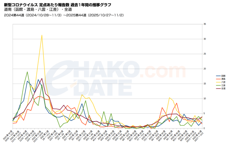 - 新型コロナ感染者・道南の定点報告数・函館2.20↑(第44週 10/27~11/2):11/6