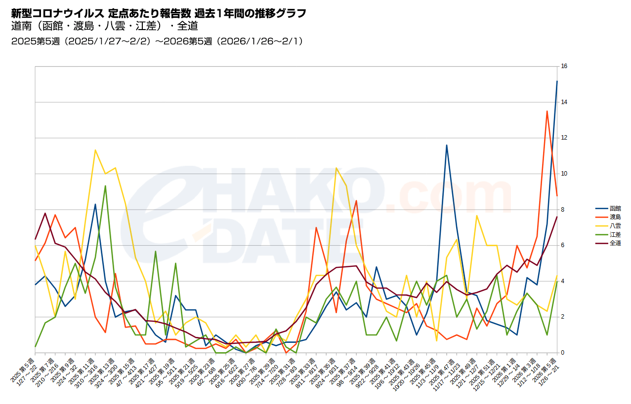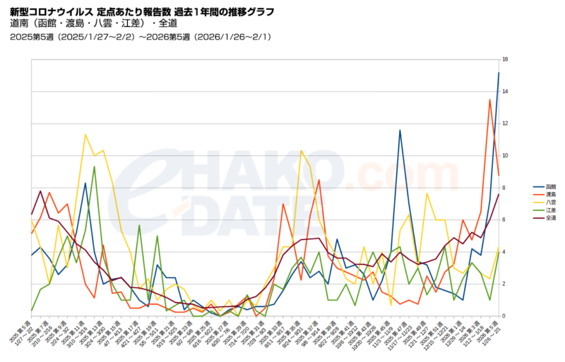 - 新型コロナ感染者・道南の定点報告数・函館15.20↑(第5週 1/26~2/1):2/5