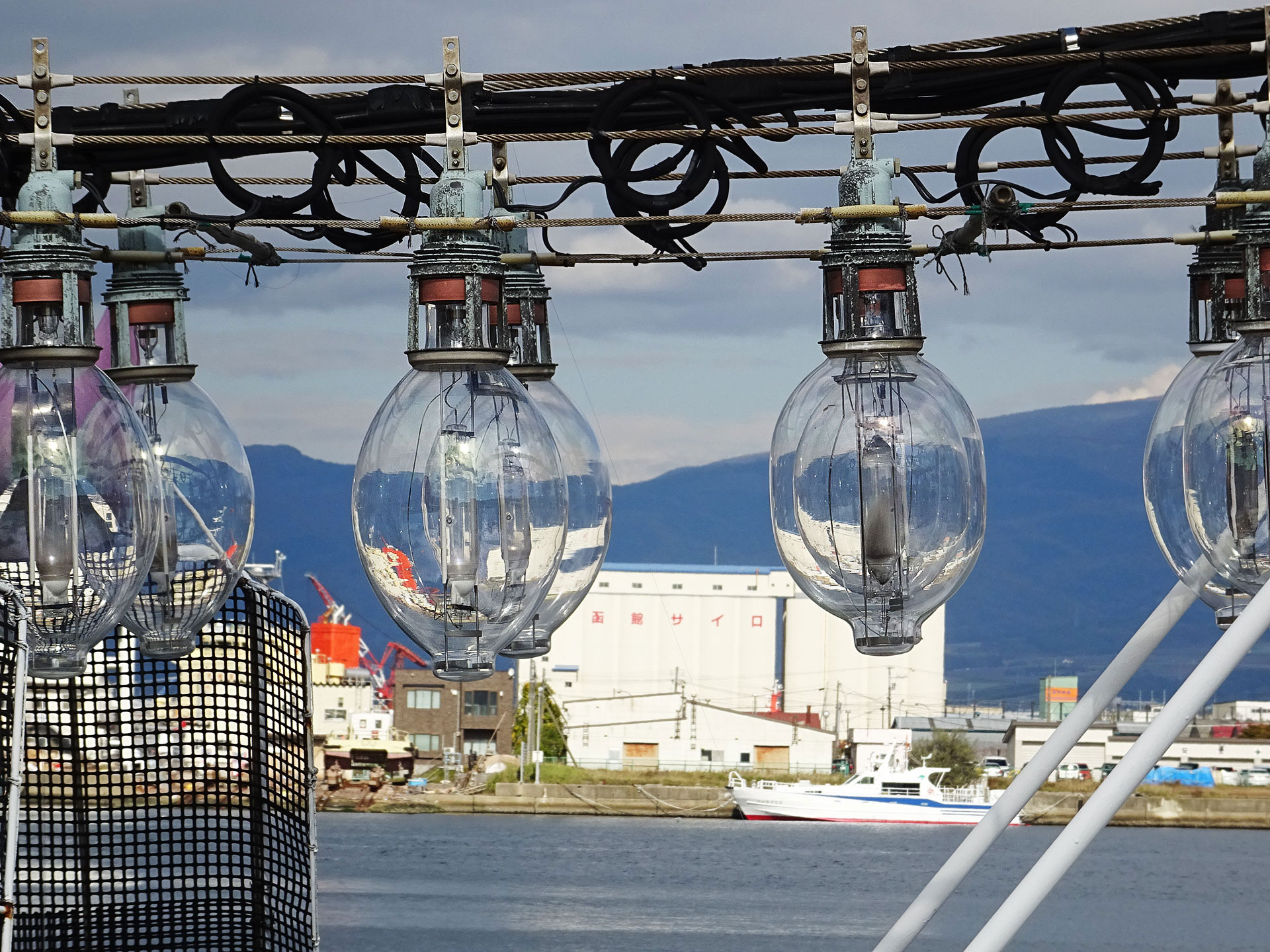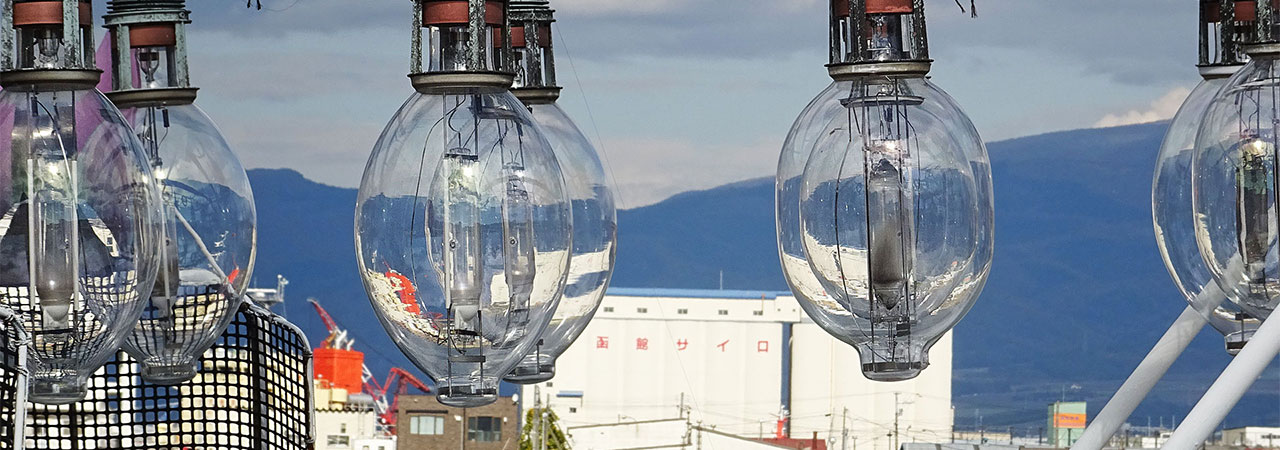 中央ふ頭にて、漁り火の電球。長く続いた不漁でイカ漁船の数も減ってきた中で生き残ってきて、やっと獲れだしたタイミングでの休漁、関係者の皆さんはさぞ無念と思います。堂々と不満を訴えていいと思うんですよね、問題は一律で雑に考えてしまっている無責任な水産庁・農林水産省側にしか見えないので。